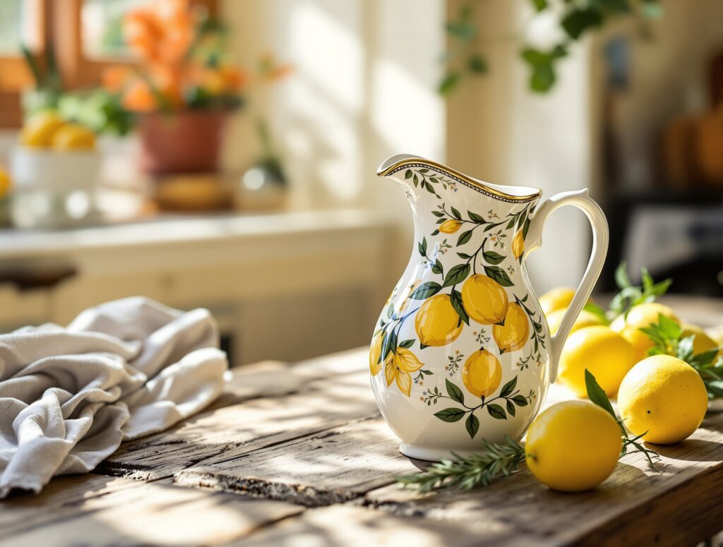 En italiensk kande formet som en citron er et smukt, håndmalet stykke keramik. Den kombinerer funktionalitet med et elegant design